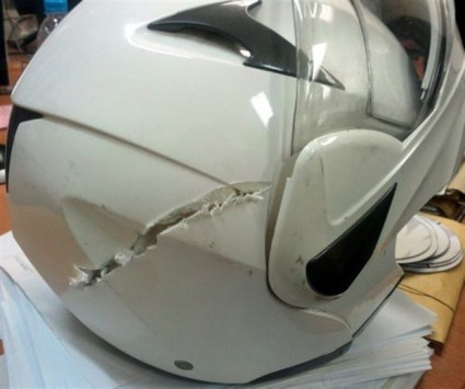 Ευτυχώς για μια γυναίκα της ομάδας ΔΙΑΣ που οι σφαίρες πέρασαν πλάι της, αλλά κυρίως για τον άνδρα που φορούσε το κράνος της φωτογραφίας, ο δολοφόνος αστόχησε. Ο θάνατος πέρασε πλάι τους.